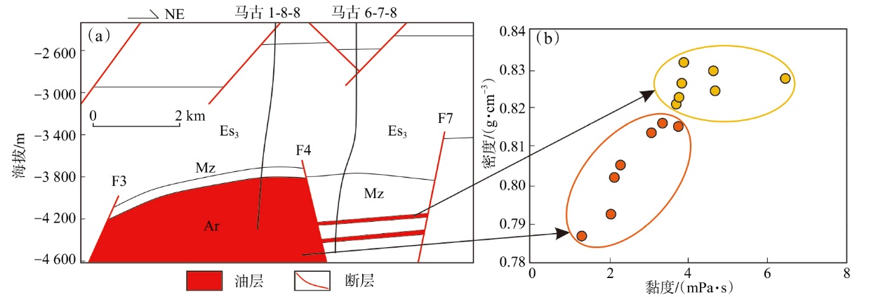 辽河坳陷兴隆台构造带南部断块太古界油气藏剖面(a)和原油物性对比(b)"