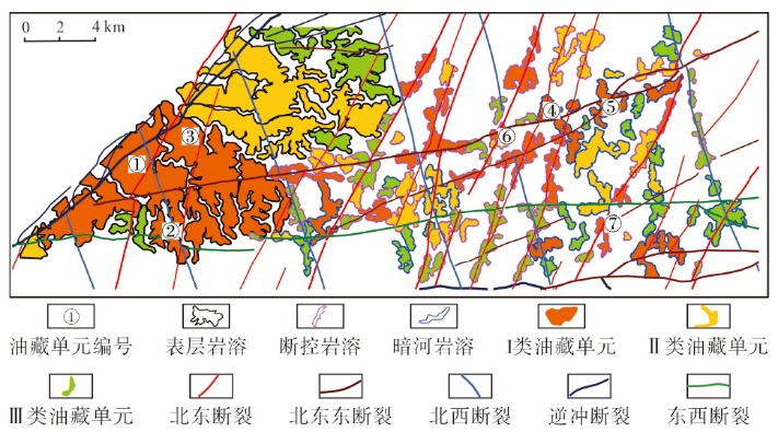 塔北地区轮古油田奥陶系缝洞型碳酸盐岩储层是中国超深层油气勘探的重要领域。基于高密度地震、测井及动态生产资料,构建了塔北地区轮古油田奥陶系缝洞型碳酸盐岩储层构造-岩溶-流体多场耦合储层预测理论框架,通过缝洞系统定量表征技术,系统揭示了储层发育规律与油气富集主控因素。研究结果表明:①轮古油田奥陶系储层非均质性较强,储集空间可划分为4种类型,晶间孔主要发育于晶粒白云岩中,孔径5~20 μm;粒间溶孔主要由鲕粒灰岩等颗粒灰岩经选择性溶蚀形成,孔径50~200 μm,为储层主要渗流通道;微裂缝宽度多小于10 μm;生物体腔孔主要发育于生物碎屑灰岩中,常见海百合茎等生物格架孔,孔径100~500 μm。②表层岩溶储层呈片状分布于古地貌高地,暗河岩溶储层沿古水系呈条带状展布,断控岩溶储层沿断裂带呈线状分布,多属性融合与三维地质建模技术可实现岩溶储层的三维空间整体雕刻。③油气的富集程度受岩溶相-断裂-储层规模控制,Ⅰ类高富集区集中于北东/北东东向断裂带、残丘厚度大于90 m、有效孔隙度大于8%,有效厚度大于550 m区域,为断裂-缝洞双输导、多期复式充注的成藏模式、“表层区侧向追踪、暗河区立体评价、断控区定向输导”的差异化开发策略可使产能提升15%~30%,新增储量大于200×104 t。