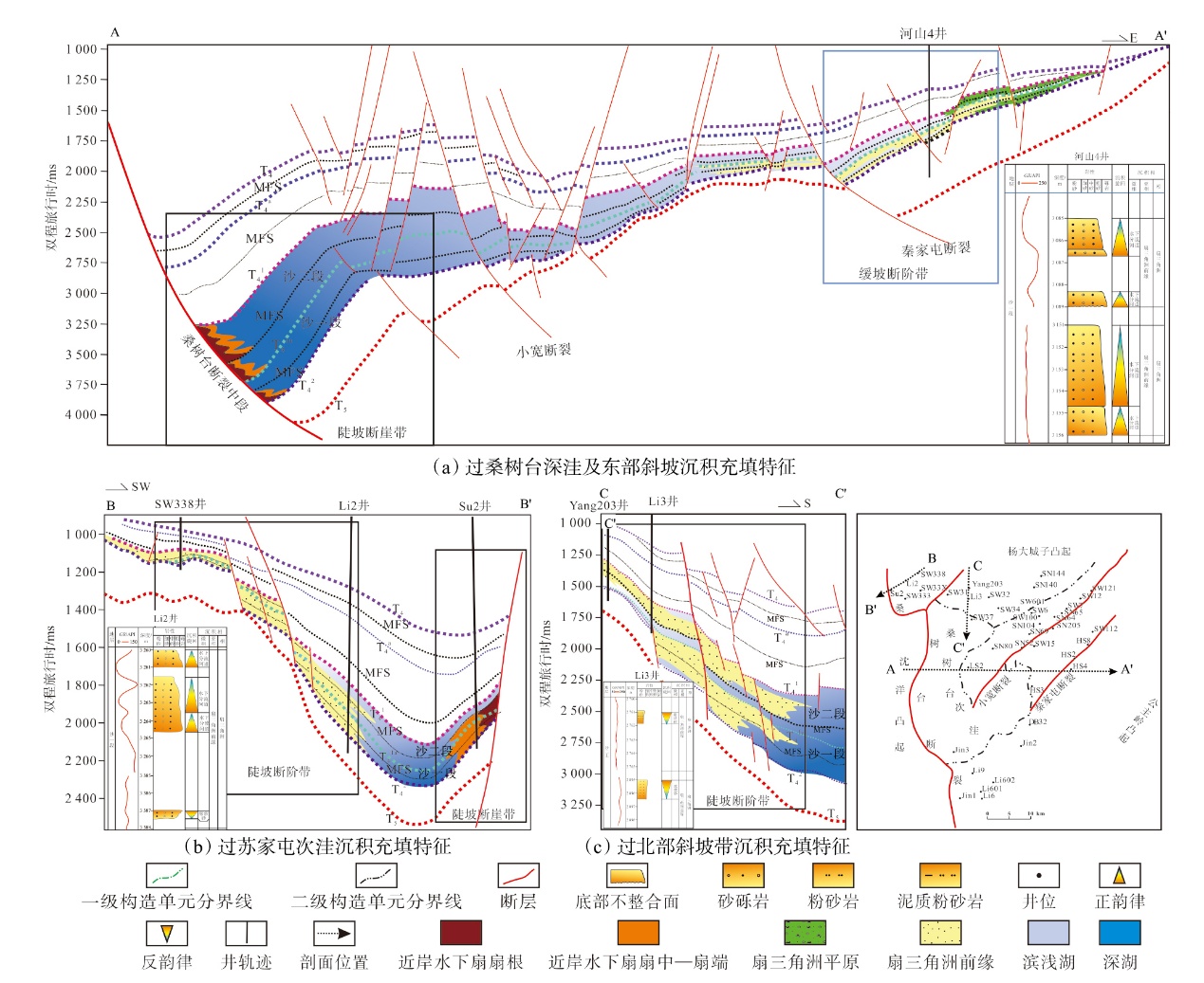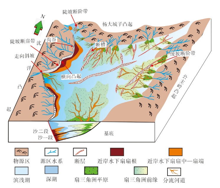 综合运用测录井资料及地震解释成果,对松辽盆地南部梨树断陷白垩系沙河子组同沉积断层的活动特征进行了分析,基于印模法对古地貌进行了恢复,并探讨了古地貌对沉积体系的控制作用。研究结果表明:①梨树断陷白垩系沙二段沉积时期的断层活动速率普遍高于沙一段沉积时期,且断层活动速率向北呈先增大后减小的趋势。②沙河子组沉积期,梨树断陷陡坡带主要发育近岸水下扇及深湖沉积体系,缓坡带主要发育扇三角洲及滨浅湖沉积体系。③研究区古地貌控制着沉积相及砂体的展布,识别出了沟谷、横向凸起(水下隆起)、走向斜坡、构造坡折带等4种古地貌类型,均对砂体的分布具有控制作用。沟谷可作为输砂通道,控制砂体从源区向沉积区推进,同时也可作为沉积卸载单元;发育于陡坡断崖边缘的横向凸起促使砂体呈扇形向盆内撒开;走向斜坡控制砂体的走向延伸,同沉积断层末端活动控制了砂体自源区向盆内扩散的路径;构造坡折带控制砂体向盆内搬运迁移及其富集位置,是寻找砂岩油气藏的有利区带。④研究区沙河子组沉积期具有“多源供给—断裂控渠—古地貌聚砂”的古地貌控砂模式。