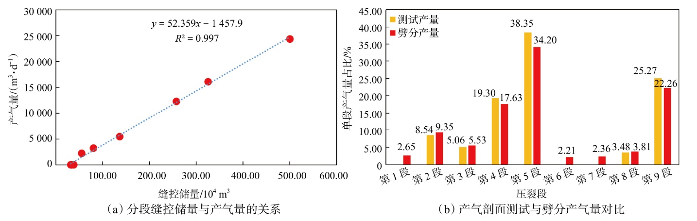 为了定量评价强非均质性气藏压裂水平井各压裂段初期产气量的贡献率,以鄂尔多斯盆地东胜气田新召气区二叠系盒1段气藏为例,基于储层地质工程参数、压裂缝特征、产气剖面测试分析,提出了综合地质工程因素的“缝控储量”的分段产量劈分新方法。研究结果表明:①东胜气田新召气区二叠系盒1段气藏压裂缝特征受到地质和工程双重因素控制,相同施工参数下,物性越好,压裂缝半长越短;相同地质条件下,施工排量越大、入地净液量越大,压裂缝半长越长,射孔簇数越多,压裂缝半长越短;同一区域,不同类型储层压裂缝半长与波及宽度比一致。②水平段各压裂段产出明显受到地质工程因素影响,物性好、含气性好、压裂施工规模大,压裂后产能越高。③综合考虑地质工程因素,明确改造的“缝控储量”与强非均质性气藏水平井各压裂段初期产能呈线性关系,相关系数达到0.997,表现为缝控储量高,各压裂段产能占比高。通过“缝控储量”劈分方法与产气剖面测试结果对比发现,Ⅰ类、Ⅱ类储层各段劈分产气量相对误差在12%以内。