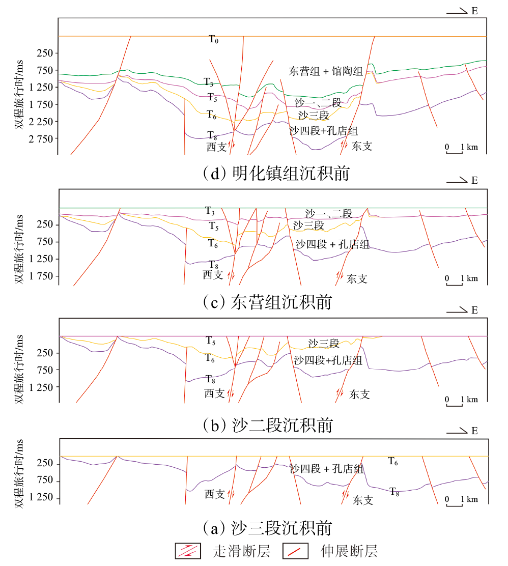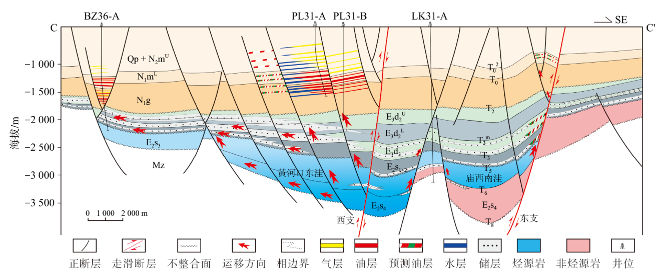 综合应用三维地震资料、钻测井资料及地球化学测试资料对渤海湾盆地庙西南地区洼陷结构、构造演化特征、烃源岩分布及控藏作用进行了研究。研究结果表明:①庙西南地区为郯庐走滑断裂改造型洼陷,始新世中晚期,在近东西向挤压应力场作用下,洼陷结构由NWW向转变为NEE向,沙河街组四段由东向西遭受剥蚀强度逐渐减弱,东侧庙西南洼沙四段烃源岩剥蚀殆尽,西侧黄河口东洼沙四段高硫咸化优质烃源岩得以保留。②黄河口东洼发育深切至沙三段—沙四段烃源岩的长期活动断裂,油气沿通源断层向上运聚,具有深、浅层复式成藏特征。③庙西南洼陷仅发育低熟的沙三段烃源岩,且通源断层晚期活动性差,油气难以突破东营组厚层泥岩盖层,仅在深层沙一段和沙二段发现天然气藏。始新世中晚期,中国东部近东西向挤压活动对盆缘洼陷结构、烃源岩展布、油气成藏均具有重要控制作用。